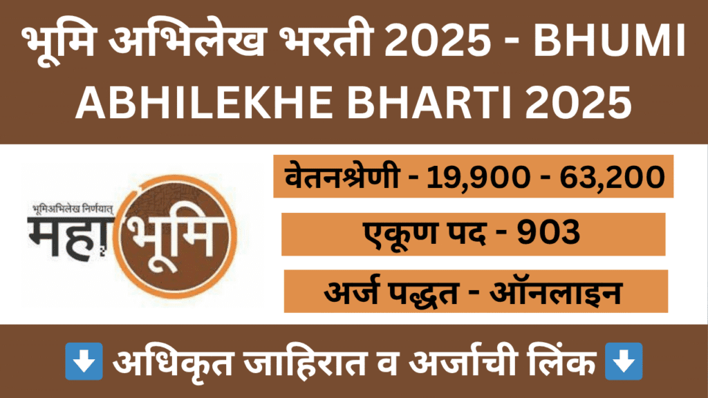 महाराष्ट्र शासनाच्या भूमि अभिलेख विभागातर्फे गट-क मधील भूकरमापक पदांसाठी मोठ्या प्रमाणात भरती प्रक्रिया सुरू झाली आहे. भूमि अभिलेख विभाग भरती 2025 साठी एकूण तब्बल 903 पदासाठी अर्ज मांगविण्यात आले आहे. ही एक सुवर्णसंधी आहे त्या उम्मेदवारांसाठी जे सरकारी नोकरीच्या शोधात आहे. इच्छुक व पात्र उमेदवारांनी खालील दिलेली जाहिरात वाचून ऑनलाइन अर्ज करावा.