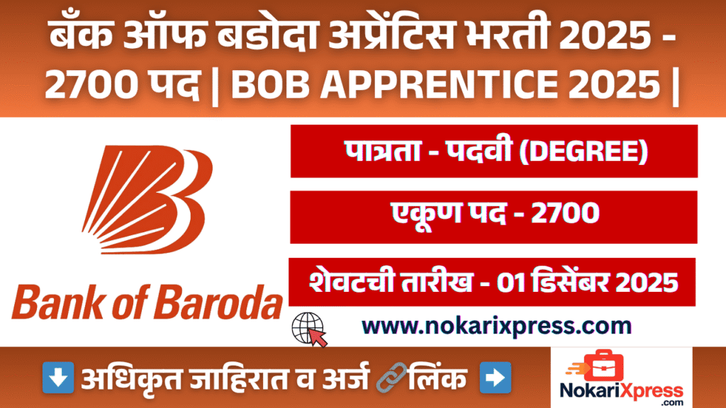 बँक ऑफ बडोदा (Bank of Baroda) ने अप्रेंटिस Act 1961 अंतर्गत 2700 प्रशिक्षणार्थी (अप्रेंटिस) पदांसाठी भरती जाहीर केली आहे. ही बँक ऑफ बडोदा प्रशिक्षणार्थी नोकरी बँकेमध्ये काम करण्यासाठी व तेथील अनुभव घेण्यासाठी इच्छुक असलेल्या उमेदवारांसाठी एक उत्तम संधी आहे. या भरतीत एकूण 2700 रिक्त पदे आहेत व अर्ज करण्याची शेवटची तारीख 01 डिसेंबर 2025 आहे. तरी सर्व इच्छुक व पात्र उमेदवारांनी खालील दिलेली अधिकृत जाहिरात वाचून ऑनलाइन अर्ज करावा.