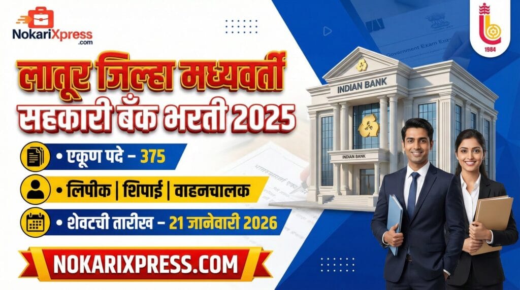 लातूर जिल्हा मध्यवर्ती सहकारी बँक लिमिटेड, लातूर यांनी लिपीक (लेखनिक), शिपाई/सबग्रेड (Multipurpose Support Staff) आणि वाहन चालक या पदांसाठी एकूण 375 जागांची भरती जाहिरात प्रसिद्ध केली आहे. लातूर