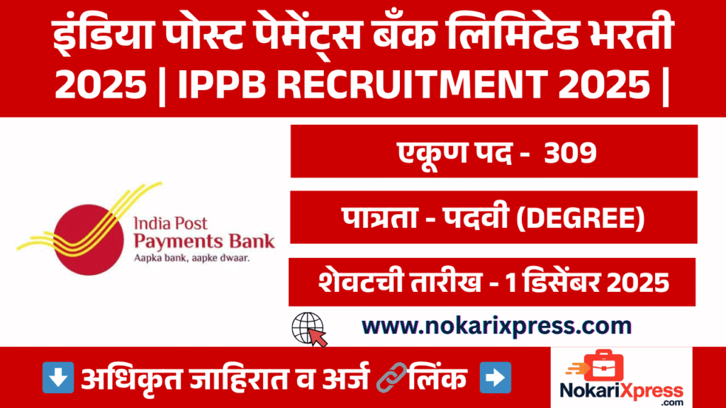 भारत सरकारच्या डाक विभागाच्या अंतर्गत कार्यरत असलेली इंडिया पोस्ट पेमेंट्स बँक लिमिटेड (IPPB) ने देशभरातील विविध ठिकाणी जूनियर असोसिएट आणि असिस्टंट मॅनेजर या पदांसाठी एकूण 309 जागा जाहीर केल्या आहेत. केंद्र सरकार, राज्य सरकार, सार्वजनिक क्षेत्रातील उपक्रम (PSU) आणि स्वायत्त संस्थांमधील कर्मचारी या भरतीसाठी अर्ज करू शकतात. तरी सर्व इच्छुक व पात्र उमेदवारांनी खालील दिलेली अधिकृत जाहिरात वाचून ऑनलाइन अर्ज करावा.