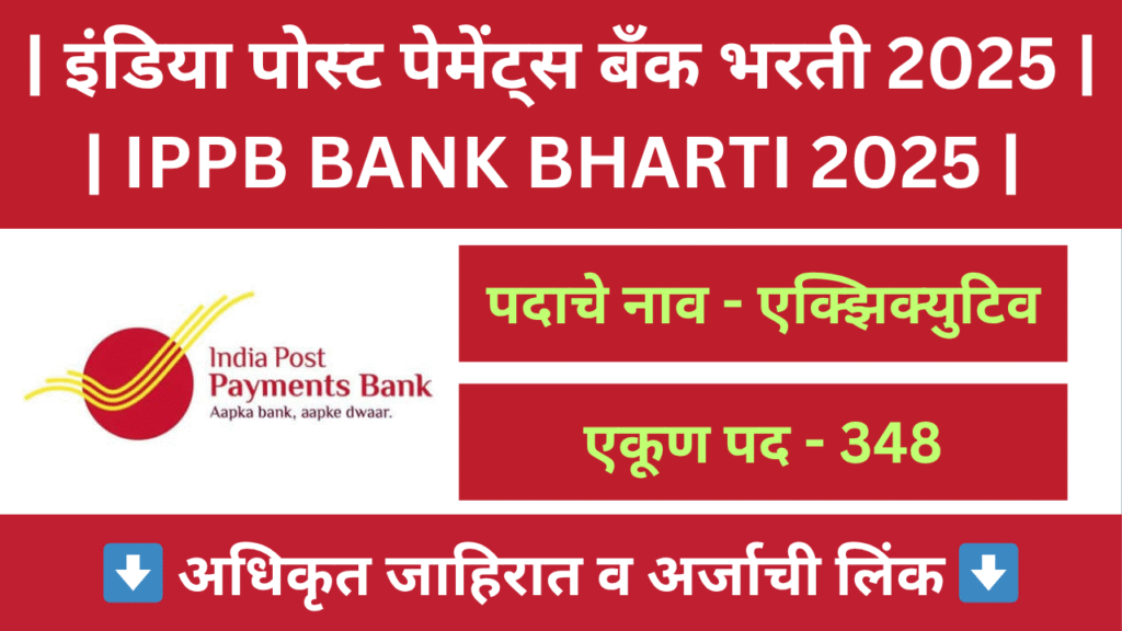 ▪️इंडिया पोस्ट पेमेंट्स बँक (IPPB) एक्झिक्युटिव्ह भरती 2025 – 348 पदांसाठी सुवर्णसंधी!