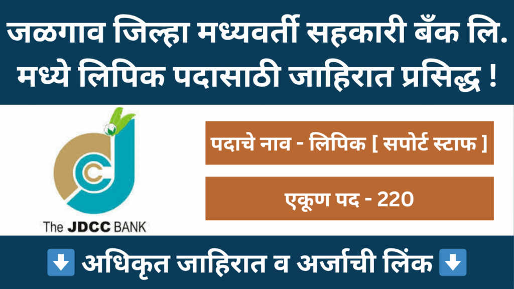 जळगाव जिल्हा मध्यवर्ती सहकारी बँक लिमिटेड (JDCC बँक) ने लिपिक (सपोर्ट स्टाफ) पदासाठी भरतीची जाहिरात प्रसिद्ध केली आहे. ही एक उत्तम संधी आहे तरुण आणि पात्र उमेदवारांना बँकिंग क्षेत्रातील कारकीर्द सुरू करण्यासाठी. या भरतीत एकूण 220 रिक्त जागा आहेत. अर्ज करण्याची शेवटची तारीख ही 31 ऑक्टोबर 2025 आहे, तरी सर्व इच्छुक व पात्र उमेदवारांनी खालील दिलेली अधिकृत जाहिरात वाचून ऑनलाइन अर्ज करावा.