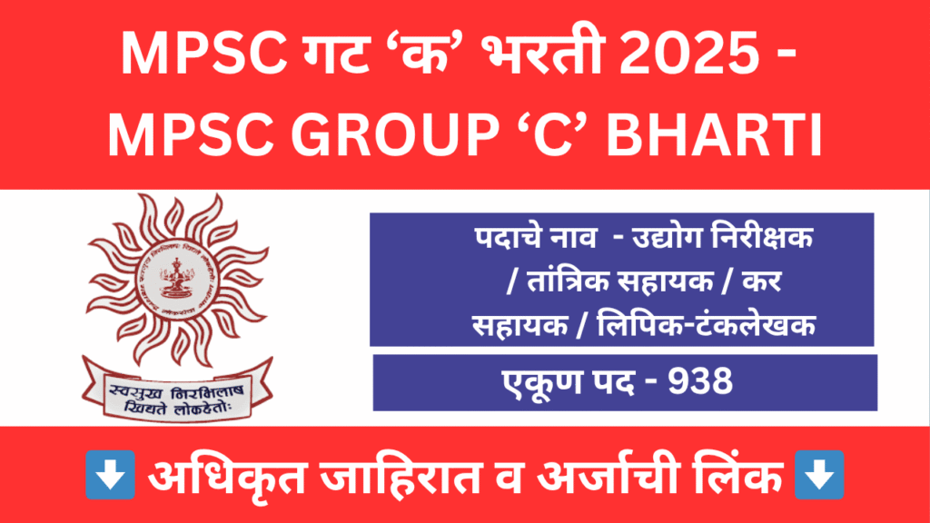 महाराष्ट्र लोकसेवा आयोग (MPSC) ने गट क सेवा संयुक्त पूर्व परीक्षा 2025 साठी अधिसूचना जारी केली आहे. या भरतीद्वारे राज्यातील विविध विभागांमध्ये एकूण 938 रिक्त पदांवर भरती करण्यात येणार आहे. ज्यांना महाराष्ट्र शासनाच्या विविध सेवांमध्ये करिअर करायचा आहे, त्यांच्यासाठी ही एक सुवर्णसंधी आहे. या लेखातून आम्ही तुम्हाला या MPSC गट क नोकरी 2025 ची सर्व महत्त्वाची माहिती, पात्रता, निवड प्रक्रिया, व अर्ज कसा कराल याबद्दल संपूर्ण मार्गदर्शन देणार आहोत. तरी सर्व इच्छुक व पात्र उमेदवारांनी खालील दिलेली माहिती व अधिकृत जाहिरात वाचून अर्ज करावा.