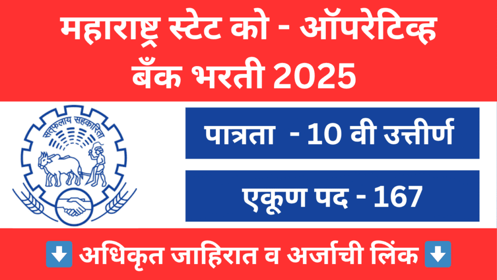 महाराष्ट्र राज्य सहकारी बँक लिमिटेड (MSC Bank) मार्फत १६७ रिक्त पदांसाठी भरती जाहीर करण्यात आली आहे. महाराष्ट्रातील रहिवाशांसाठी ही एक सुवर्णसंधी असून शिपाई, चालक, टंकलेखक आणि इतर विविध पदांसाठी ऑनलाईन अर्ज मागविण्यात येत आहेत.ही भरती तुम्हाला स्थिर, सुरक्षित आणि प्रतिष्ठित करिअरकडे वाटचाल करण्याची संधी देऊ शकते. इच्छुक उमेदवारांनी अधिकृत संकेतस्थळावर जाऊन ऑनलाईन पद्धतीने आपला अर्ज सादर करावा.