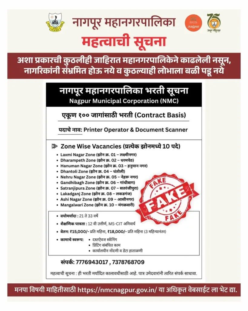 Nagpur Mahanagarpalika Bharti 2026 मध्ये नागपूर शहराच्या 10 झोनमध्ये एकूण 100 जागा आहेत. प्रत्येक झोनमध्ये 10 Printer Operator & Document Scanner पदे आहेत. माझ्या सल्ला आहे की आपल्या जवळच्या झोनसाठी अर्ज करा: