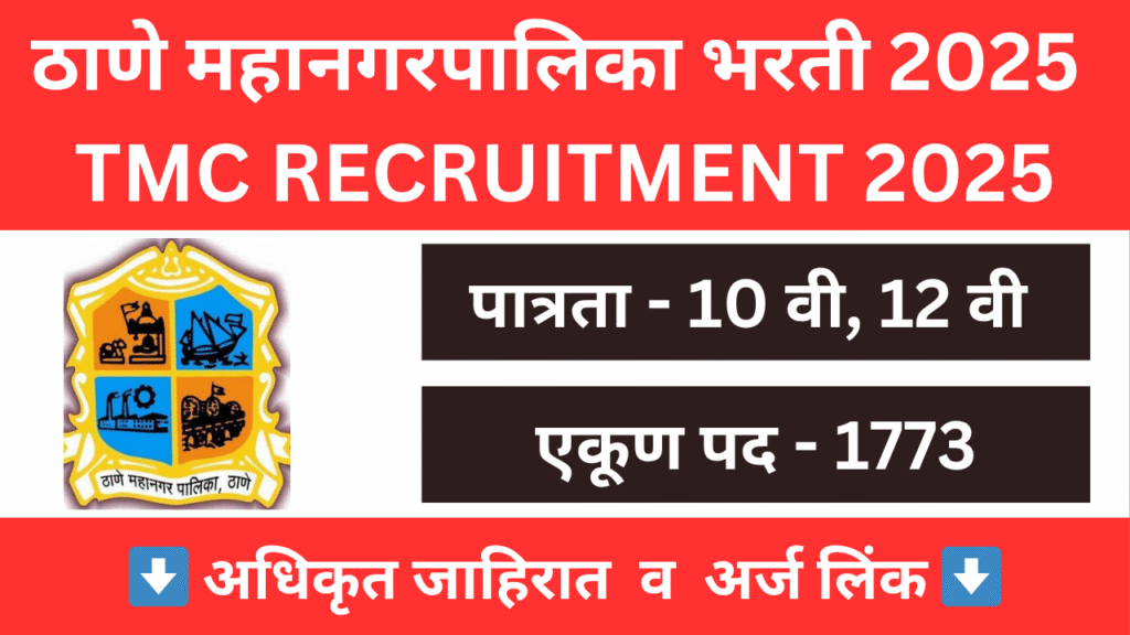 ठाणे महानगरपालिका विविध विभागांतील गट-क आणि गट-ड श्रेणीतील रिक्त पदे भरण्यासाठी मोठ्या प्रमाणात सरळसेवा प्रवेशाने भरती प्रक्रिया राबवित आहे. या भरतीत एकूण 1,773 रिक्त पदे असून, यामध्ये विविध शैक्षणिक पात्रतेनुसार उमेदवारांना संधी उपलब्ध आहे. भरतीसाठीची अधिकृत जाहिरात प्रसिद्ध करण्यात आली असून, सर्व पात्र आणि इच्छुक उमेदवारांनी खाली दिलेली अधिकृत जाहिरात वाचून ऑनलाइन पद्धतीने अर्ज करावा.